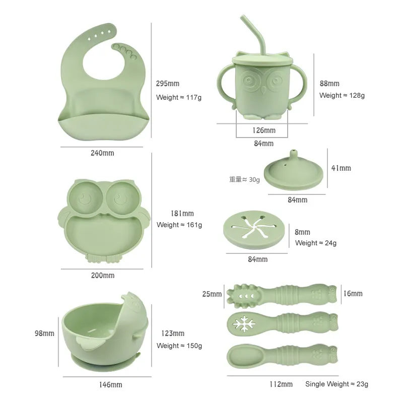 All components are made of 100% food-grade silicone, certified BPA-free, phthalate-free, and safe for microwave, freezer, and dishwasher use. The materials are soft, unbreakable, and gentle on gums and developing teeth.